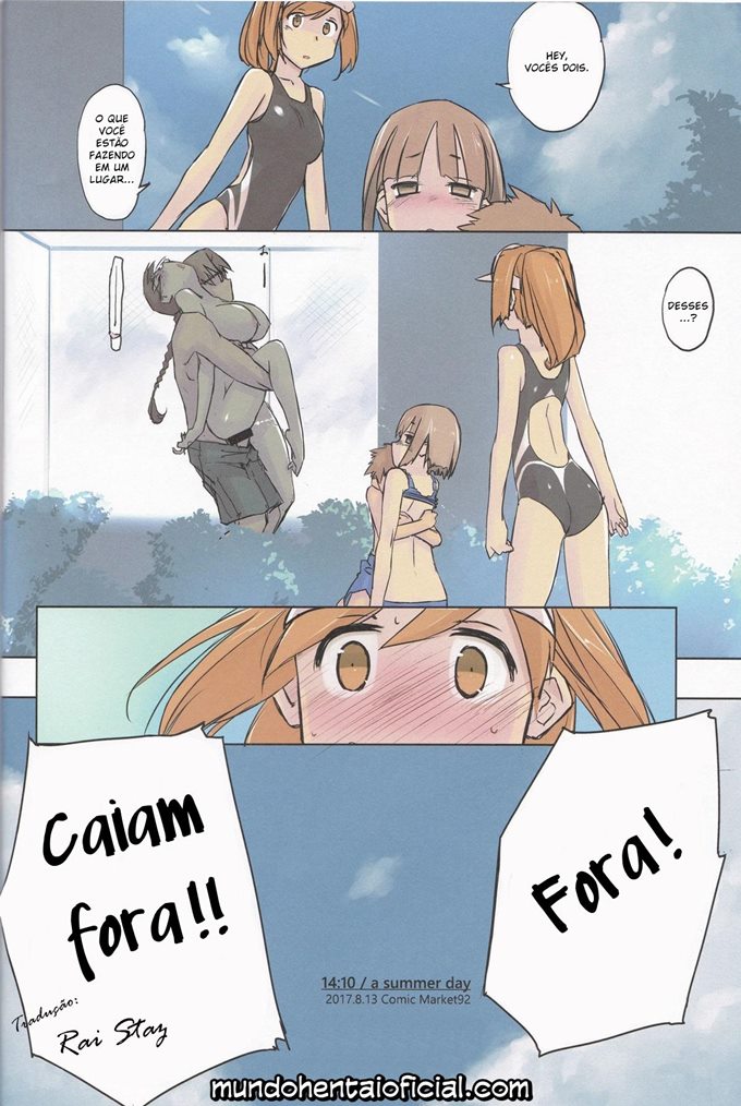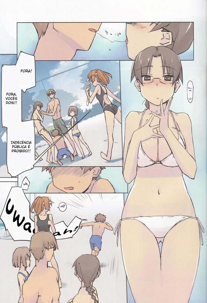 Depois que seus dois vizinhos pequenos pediram muito para ela, ela finalmente decidiu leva-los a piscina publica. O dia estava lindo e sol estava muito quente, o dia estava apropriado para dar uma molhada. Mas quando ela estava olhando para a piscina o seu vizinho chegar por trás dela e tira seu sutiã e seus peitos ficaram para fora. Agora ela está correndo atrás dele para poder pegar seu sutiã de volta.