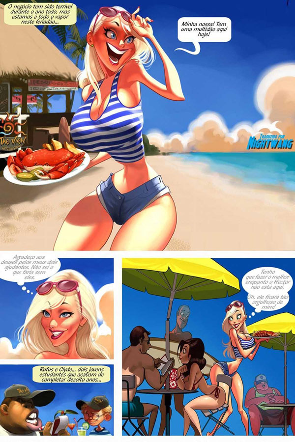 O negocio não vinha nada bem o ano inteiro, mas graças ao feriado a praia encheu e estamos vendendo muito. Ela é muito grata aos seus dois ajudantes que estão ajudando muito nesse dia de muito movimento. Cassie quer fazer tudo certo para mostrar para seu marido que está indo tudo bem. Aqui nos quadrinhos eroticos e Hentai o marido de Cassie está no hospital já tem uma semana, depois do acidente que ele sofreu, então Cassie só pode contar com os seus ajudantes. Mas depois do dia de trabalho eles queriam seus pagamentos, mas eles queriam de uma outra maneira.