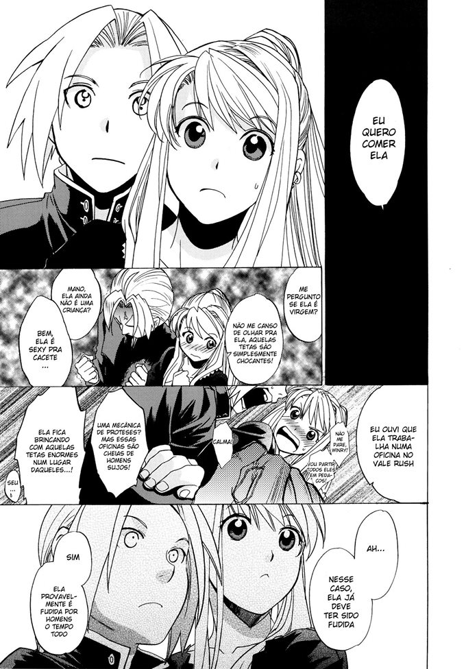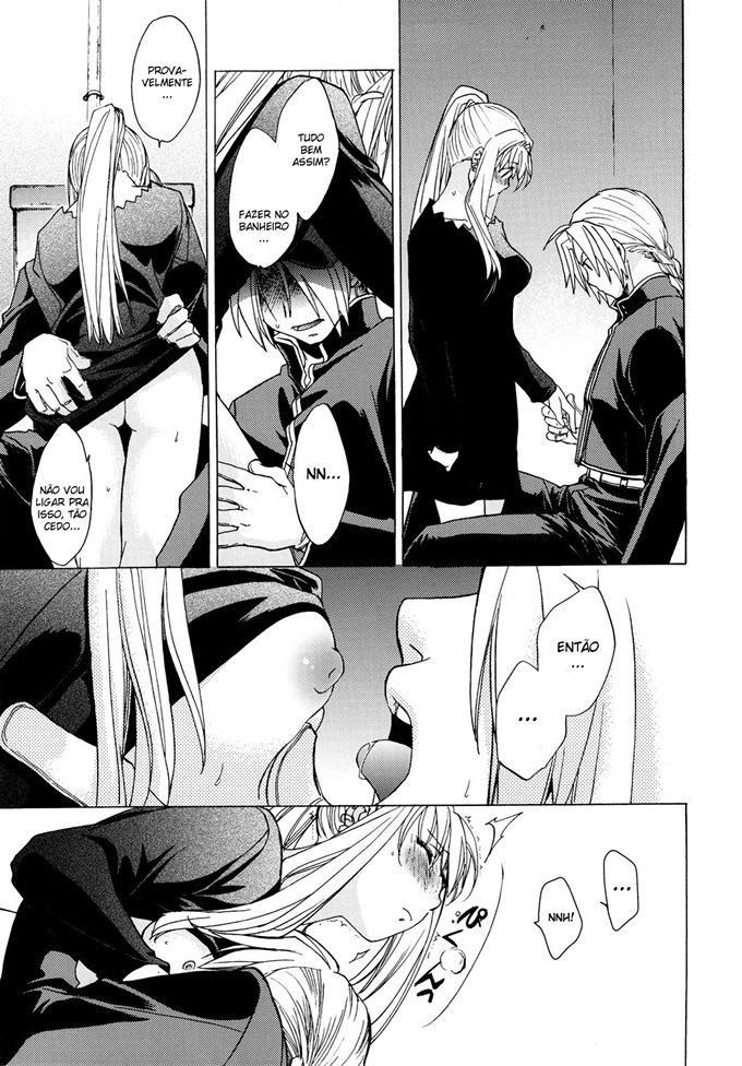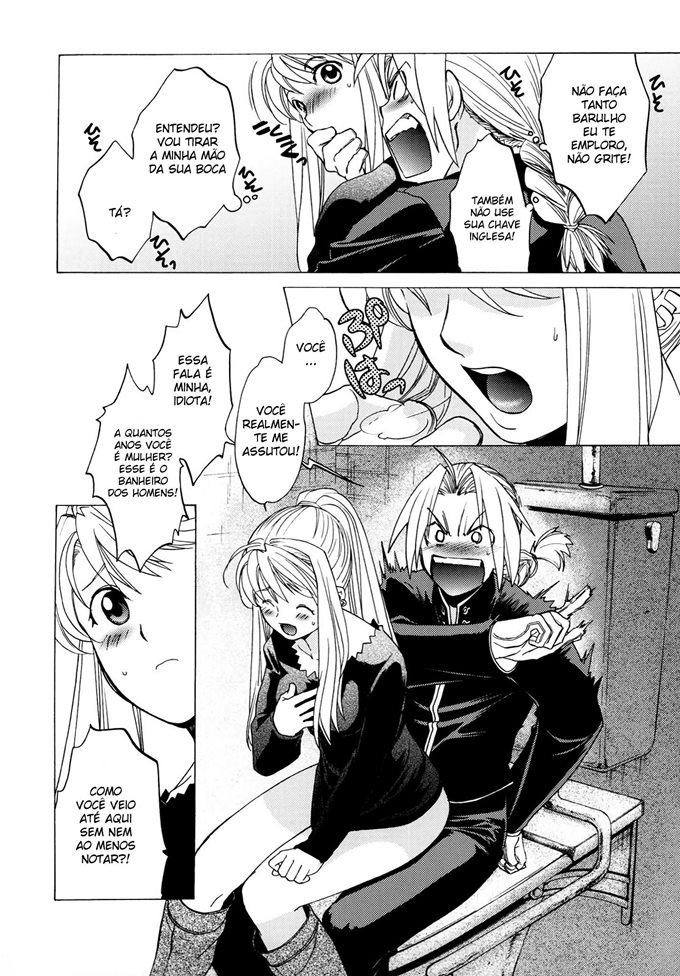 Como Winry é uma grande mecânica o exercito decidiu mate-la sobre sua proteção. Assim ela poderia ajuda-los com seus novos projetos e ninguém usaria suas habilidades para o mal. Mas Winry está cansada de ficar presa e pede para ir para o banheiro, lá é o único momento que ela tem paz e pode ficar sozinha. Mas ela sem querer acaba entrando no banheiro masculino e sentando no colo do Edward. Ele então tampa a boca dela e diz para ela não gritar pois se não os dois estarão com problemas. Eles aproveitaram que estavam sozinhos ali no banheiro e decidiram partir para putaria do hq de sexo.