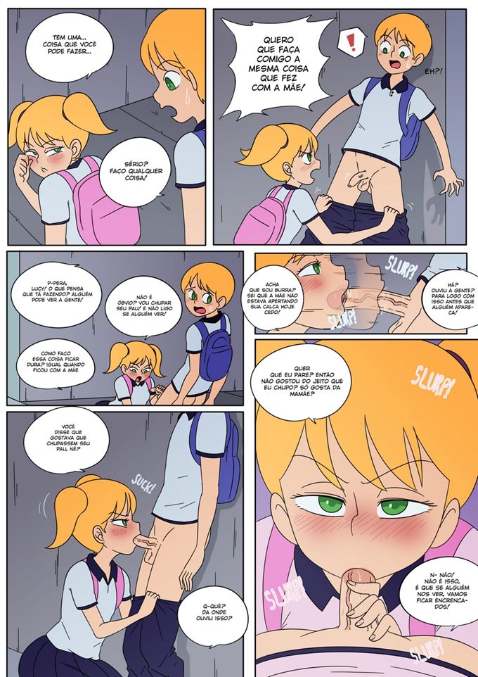 Essa safadinha estava em um sono profundo quando acaba sendo acordada por um barulho vindo do quarto de sua mãe. Achando estranho ela vai até lá para poder ver o que está acontecendo. Ela então pega sua mãe fodendo com seu irmão mais novo e perguntando para ele se a bocetinha dela está gostosa e ela fica extremamente excitada com aquela cena. No dia seguinte ela não consegue tirar aquilo da cabeça e acaba pegando sua mãe chupando o pau de seu irmão.