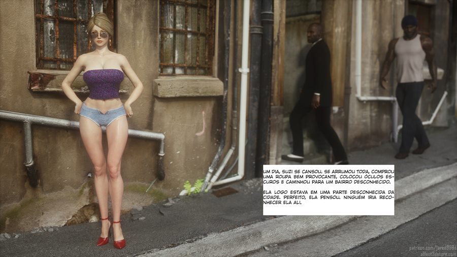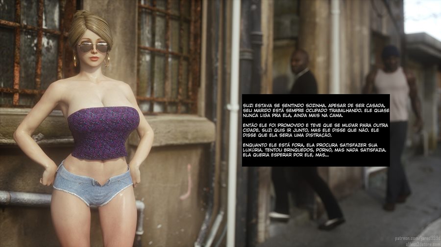 Suzi é um loira muito gostosa e fogosa, mas seu marido está sempre trabalhando e não sobra tempo para ela. Por causa disso essa safadinha fica bastante tempo sem sexo e ela já estava ficando louco com isso. Então enquanto seu marido está trabalhando ela vai para a rua ver se encontra com alguém para poder foder ela. Então um negão vendo aquela loira gostosa pensou que ela era uma garota de programa e perguntou quantos que era o programa. Essa putinha então diz que é de graça e ele só tem que satisfaze-la e fazer muito hentai.