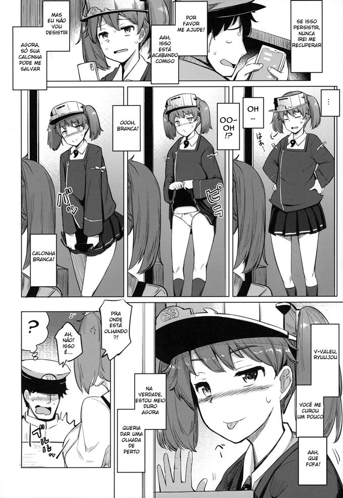 Ela vai até a sala do capitão para perguntar para ele se ela deve levar a caixa para o armazém. Mas quando ela chega na sala dele ele está tomando um bronca de sua esposa. Ela está muito brava pois os funcionários estão muito devagar e diz para ele que isso está errado. Então assim que ela sai o comandante diz para manda mensagem para Ryuujou. Ele diz que precisa ver sua calcinha que só assim ele vai conseguir se acalmar.