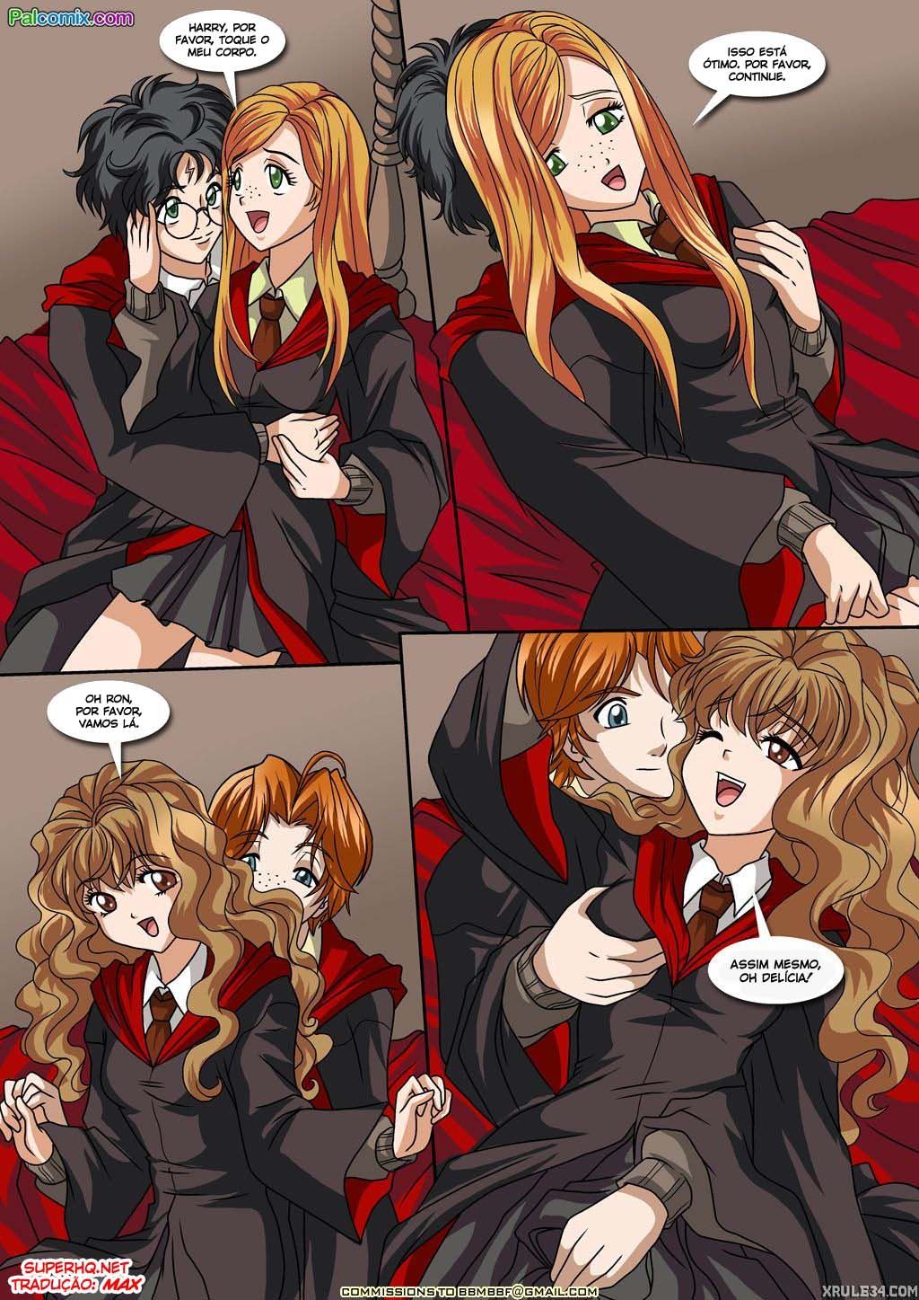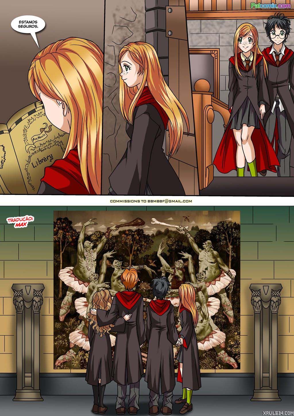 Está rolando uma orgia das boas nessa escola de bruxos onde Harry, Gina, Hermione e Ron fodem gostoso pra caralho. Essas safadinhas querem ter orgasmos e seus amigos querem mostrar que são capazes de fazer elas chegarem ao ponto G. Dessa maneira todos começaram a foder ousadamente.